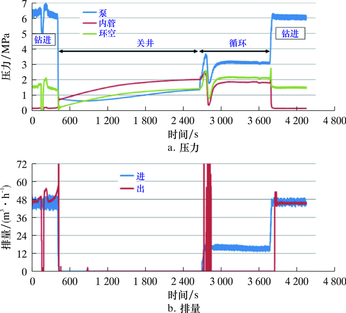 与常规钻井相比,使用双钻杆系统在较低的流速下获得了较高的机械钻速,证明双钻杆系统具有高效钻进和清洗井眼的能力。在开泵和停泵过程中,井下压力梯度保持在50 kPa之内不变。当按照自动化钻井泵控制程序在1~2 min的泵启停时间内,接单根过程中的压力变化在0.5 MPa之内。必要时,从开泵到大排量循环的较长时间内能实现较小的压力变化。