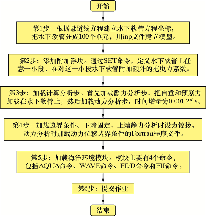 1.2 ABAQUS建模分析的水下软管属于大挠度变形,其几何非线性要重点考虑,ABAQUS适合解决此类问题[9]。悬链式单点系泊水下软管需要承受顶部张紧力、海流作用力、海浪力以及重力等作用,因此,在进行受力模拟前,应正确设置水下软管载荷边界条件。水下软管的顶部受力点处理为铰接,底部张紧力及重力可以通过前处理模块直接添加,流体浮力和拖曳力对管道的作用可通过添加AQUA模块来实现。建模流程见图 1。