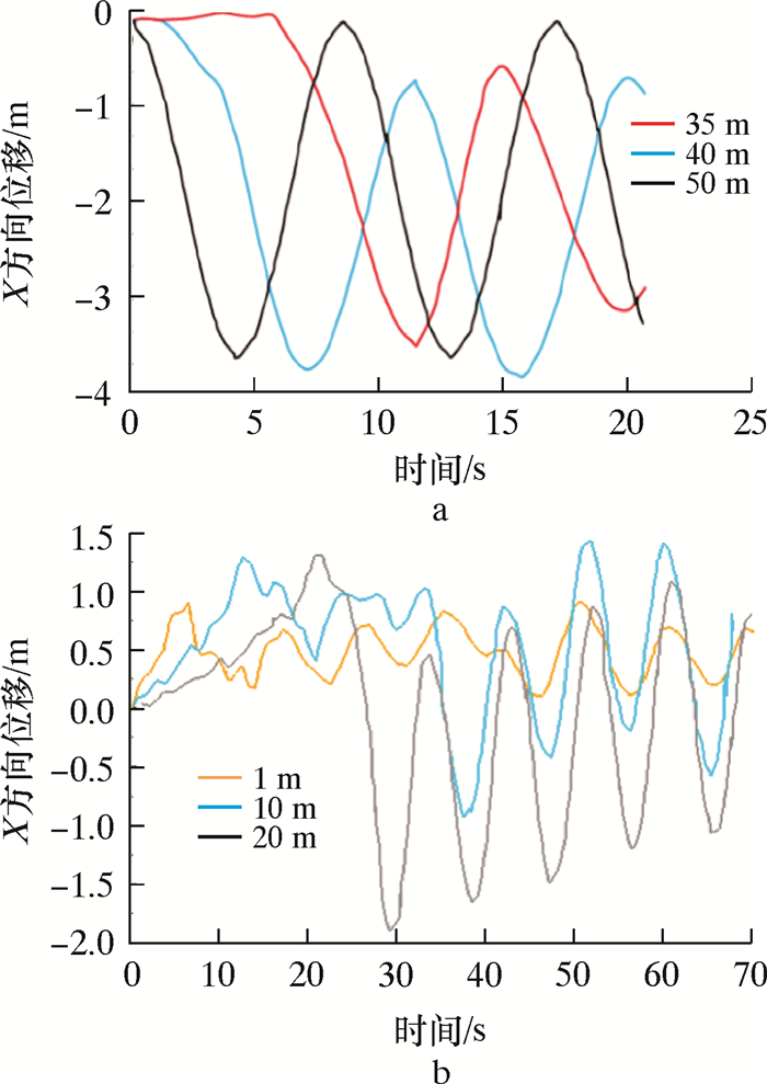 从运动曲线的趋势上看出,距离海平面越远,管线的平衡位置向X正方向移动,说明浮筒在X负方向上做谐波运动时,随着与海平面距离的增加,下部水下软管位移逐渐小于水下软管顶点位移,并最终与其反向。