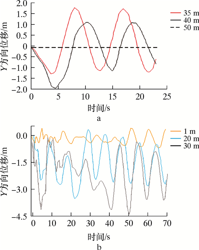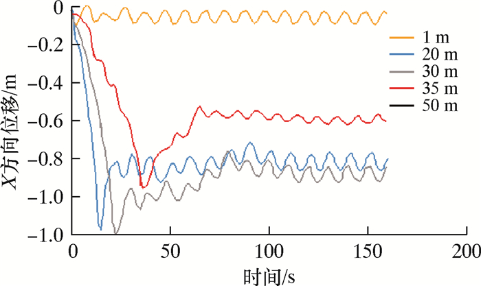 浮筒以图 7的方式运动时,水下软管的不同管段响应不同。水下软管的响应分成X方向和Y方向。以海床为基准面,以水深为增量,则水平面坐标为50。因为给水下软管顶端施加约束时限制了X方向的位移,所以50 m处水平方向无位移。在0、10、20、30和50 m处,其响应如图 8所示。由图可以看出,30 m处X方向位移比20 m处大,但随着与海床距离的缩小,X方向的位移量不断减小,水下软管底部的铰接限制了X方向位移。