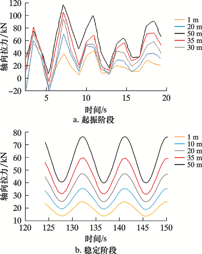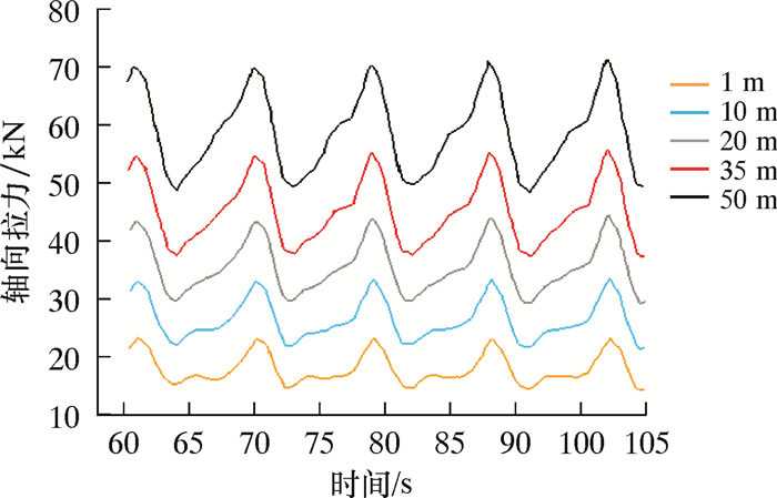 图 9为水下软管轴向拉力。由图可知,在水下软管的起振阶段,各截面的轴向拉力很不稳定,浮筒的运动周期为10 s,而在该阶段,轴向拉力的周期远小于10 s。在稳定阶段,水下软管各截面处轴向拉力呈现谐波特性,频率与激振频率相同。在海平面处轴向张力最大,与海平面距离越远,轴向拉力越小。