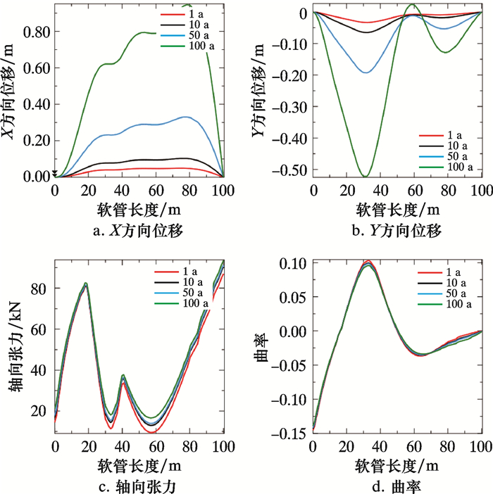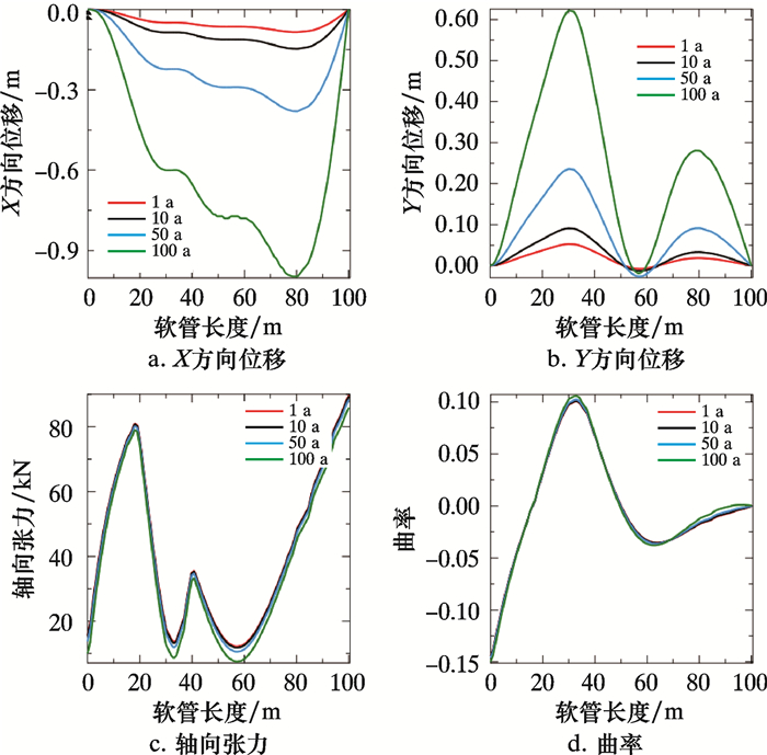 管道变形方向改变的地方是管道弯矩较大处,发生变形方向改变的点分别距离管道原点32和60 m附近处,在对管道进行疲劳分析时,应重点关注这2个区域。在水下软管顶端处,由于水流本身不稳定,所以其对水下软管的作用力也不稳定,导致水下软管的受力可能是几种环境载荷之间交替变化,从而使得水下软管承受交变应力,导致疲劳。另外,随着水流速度的增大,曲率幅值变化较小。