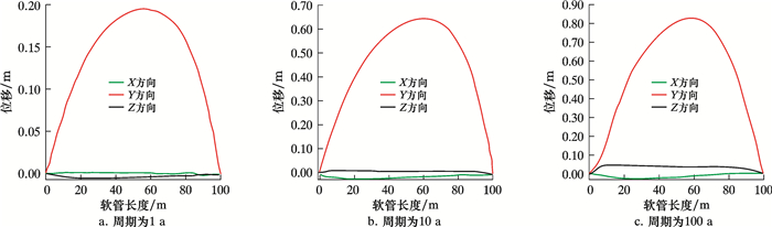 | 图 6 不同周期横流作用下软管位移 Fig.6 Displacement of the submarine hose under cross flow at different periods |