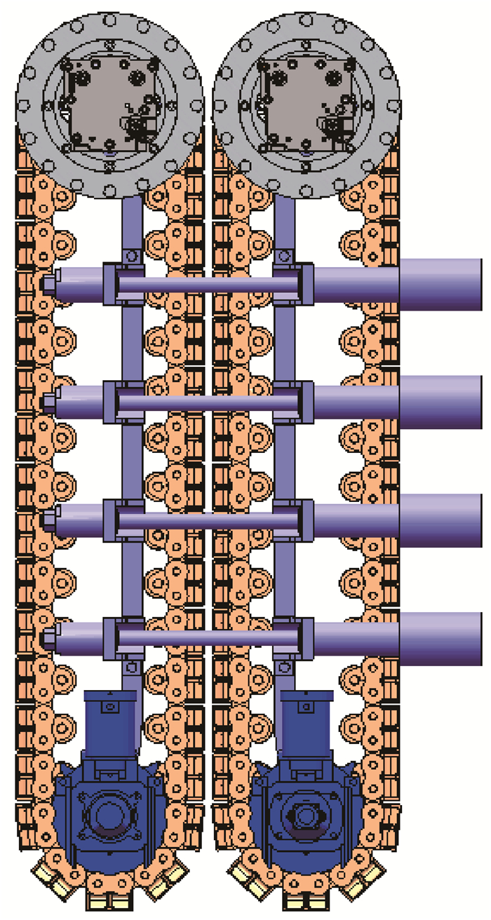 这种驱动方式由于右侧链轮的扭矩通过左侧链轮加载传递过去,右侧链轮属于随动状态,所以可使两侧夹持块很好地同步运转,齿轮箱的润滑及齿轮传动系统的精密配合相当重要。