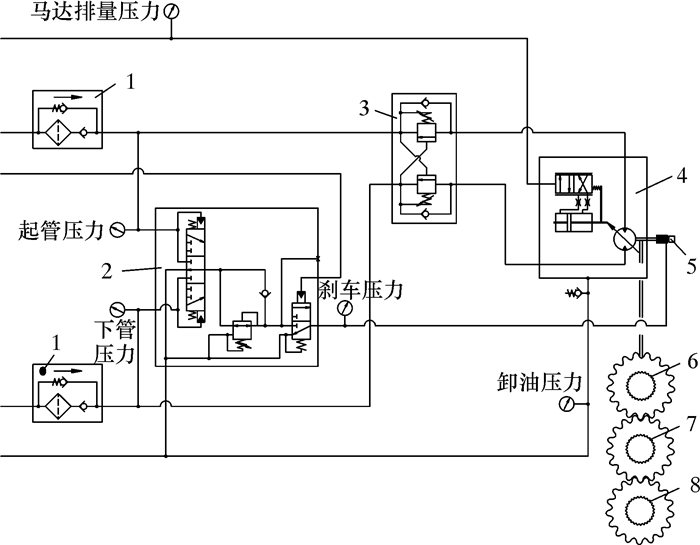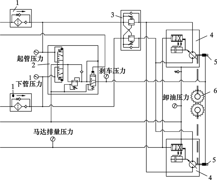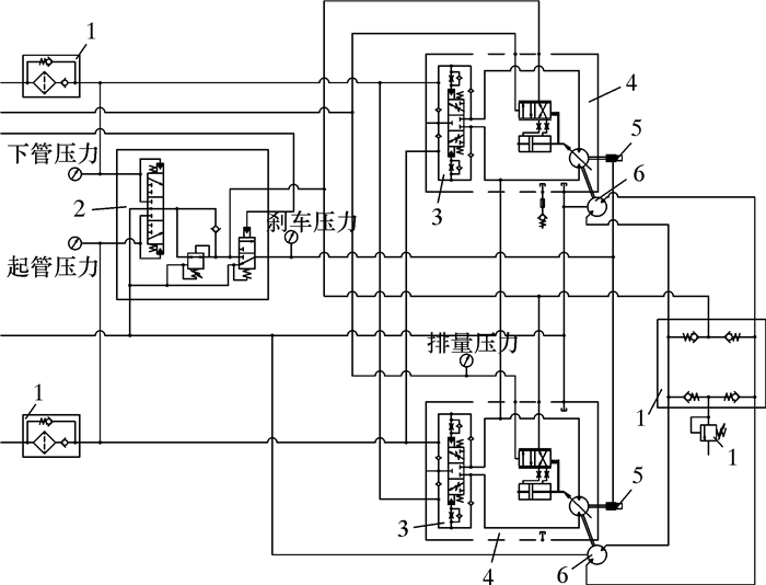 | 图 5 双马达+减速机并联驱动柔性同步系统图 Fig.5 Double motor + reducer parallel drive flexible synchronous system 1—高压过滤器;2—刹车集成块;3—平衡阀;4—无级变量马达;5—制动器;6—定量马达。 |