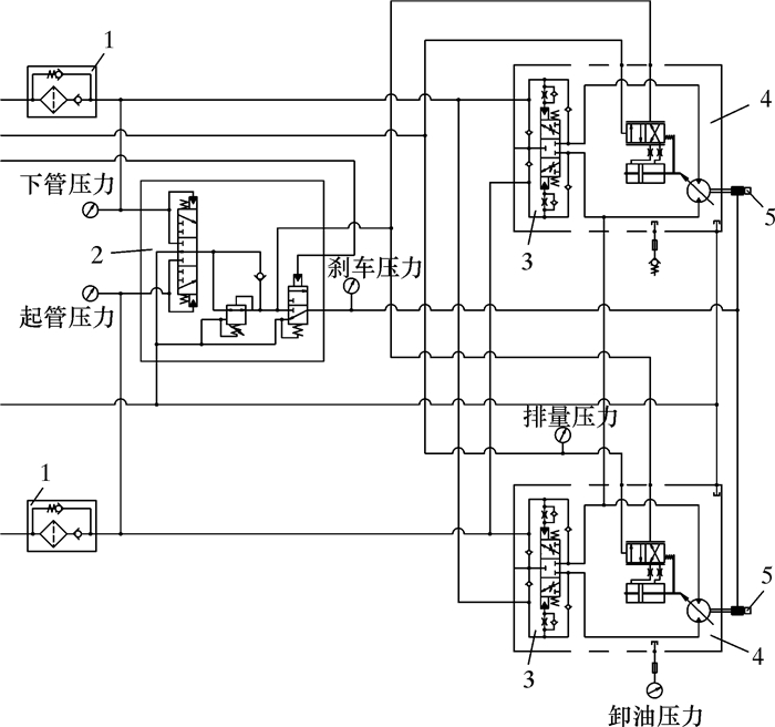 | 图 4 双马达+减速机并联驱动系统图 Fig.4 Double motor + reducer parallel drive system 1—高压过滤器; 2—刹车集成块;3—平衡阀;4—无级变量马达;5—制动器。 |
