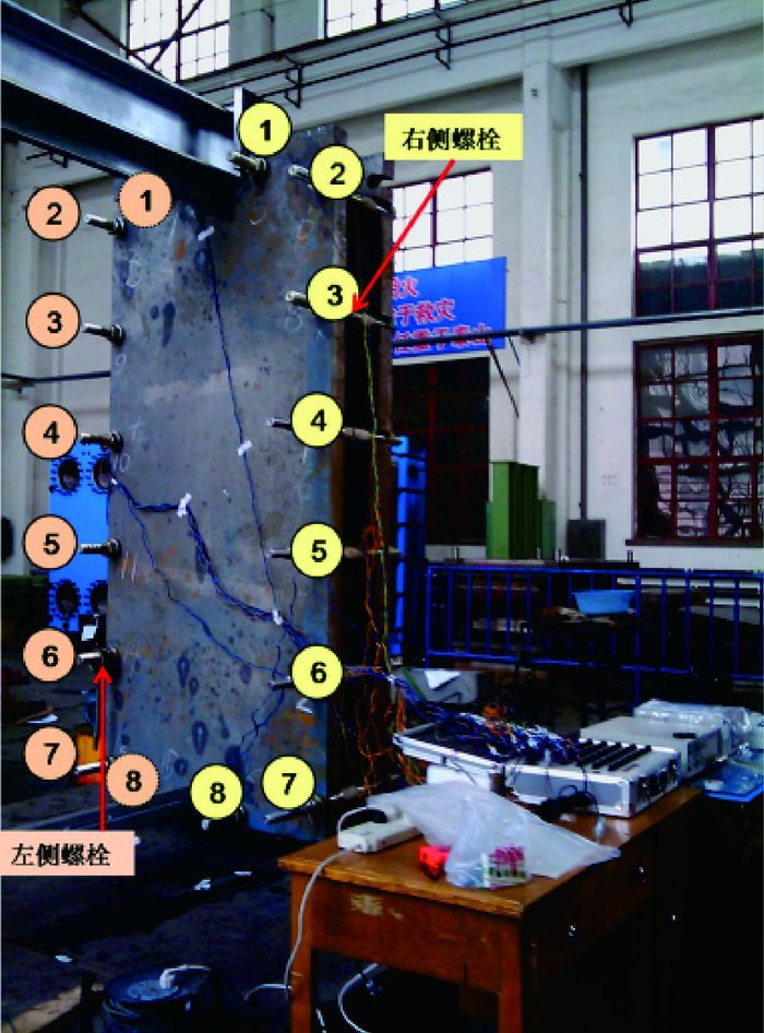 试验前,首先在夹紧螺栓上粘贴应变片并组成测力电桥,再在WE-60万能材料试验机上标定,然后预紧夹紧螺栓,使得固定压紧板和活动压紧板间距为240 mm,夹紧螺栓分布如图 1所示。在固定活动压紧板两侧分别放置一带孔参考板,待参考板和压紧板间距调整合适时,将参考板焊接固定。