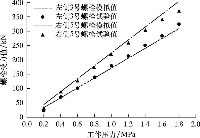 | 图 2 不同工作压力下夹紧螺栓受力值 Fig.2 Forces on the fastening bolt under different working pressures |