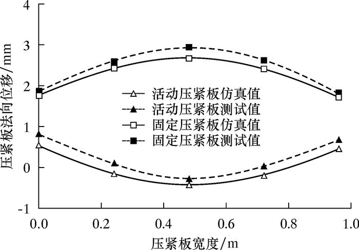 在工作压力下,固定压紧板和活动压紧板发生了鼓胀变形,沿固定压紧板和活动压紧板宽度方向取一相同位置进行测量,结果如图 3所示。由图可知,仿真与试验测试结果基本一致。因固定压紧板和活动压紧板的变形,使得板式换热器支架发生侧向偏移。在试验测试中,板式换热器支架与其他零部件之间由螺栓连接;而在仿真模拟中,其连接方式为固结,刚度大于螺栓连接,因此试验测试得到的位移曲线较仿真模拟曲线的刚体位移大。