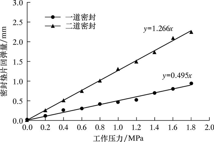 图 4为由固定压紧板和活动压紧板变形引起的密封垫片回弹量。由图可见,随着工作压力不断增大,密封垫片回弹量呈线性增长,其中二道密封垫片的回弹量是一道密封垫片回弹量的2倍多。