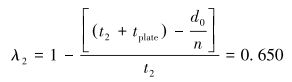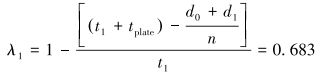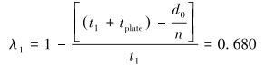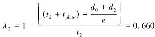 试验测试中,固定压紧板和活动夹紧板初始距离d0=240 mm。已知板式换热器换热片厚度:tplate=0.6 mm;密封垫片厚度:一道t1=5.0 mm, 二道t2=5.2 mm;换热片数量:n=60。若将密封垫片压缩比定义为垫片变形后3个主应力方向的厚度与变形前的初始厚度之比,则预紧时密封垫片一道压缩比λ1和二道压缩比λ2分别为: