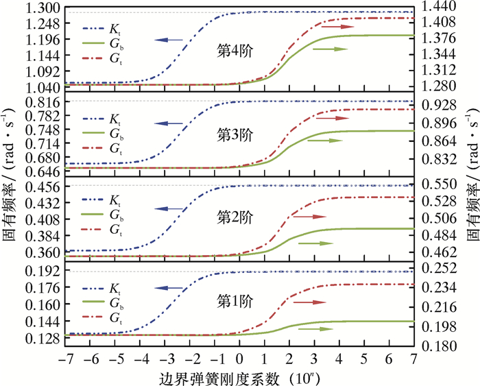 当立管底端的扭转弹簧刚度Gb、顶端扭转弹簧刚度Gt和顶端线性弹簧刚度Kt由极小(缩小至原来的10-7倍)变为极大(增加至原来的107倍)时,500 m长立管的固有频率变化趋势如图 7所示。其中,横坐标值为以10为底的刚度指数系数。