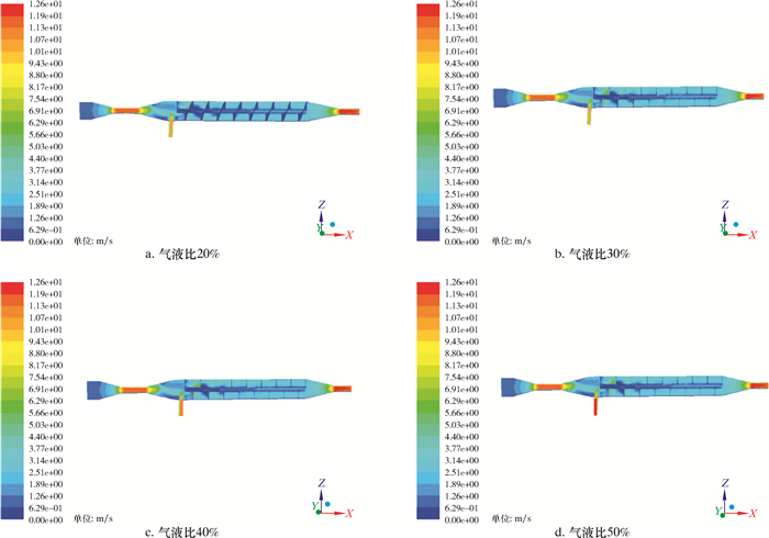 当液相入口流速为1 m/s、入口压力为大气压时,根据流体力学连续性方程可知,在不改变液相流量和压力的条件下,气液比为20%、30%、40%和50%对应的气相入射速度分别为6.25、10.70、16.70及25.00 m/s,进行数值模拟,气液两相速度分布如图 3所示。