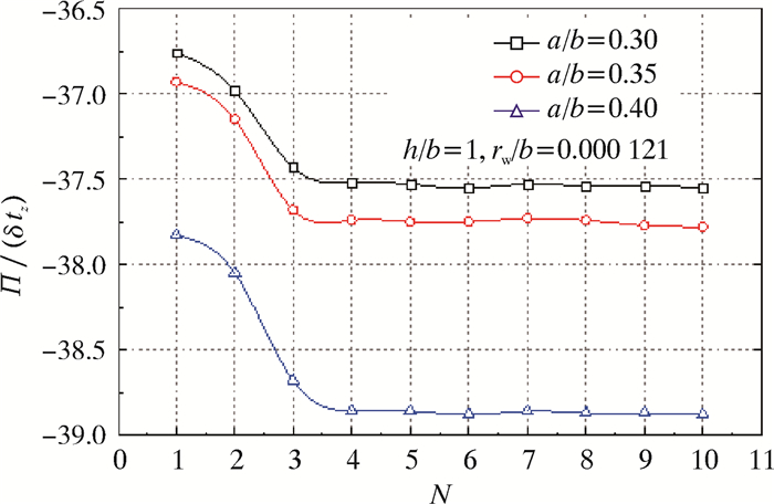 | 图 6 无因次总势能Π随项数N的收敛情况 Fig.6 The convergence of the total potential energy Π with N |