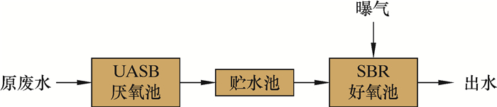 2 微生物室内培养试验研究 2.1 试验材料及工艺流程试验水样为新疆油田A区块稠油处理站高温高盐含油废水。试验装置包括UASB厌氧池、贮水池和SBR好氧池。试验工艺流程如图 1所示。试验微生物为耐盐嗜热土著菌与嗜油工程菌混合培养构建的复合菌群。