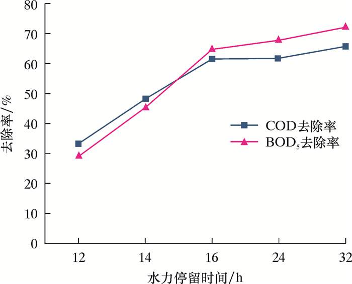 | 图 2 不同HRT下COD、BOD5的去除率 Fig.2 Removal rate of COD and BOD5 under different HRT |