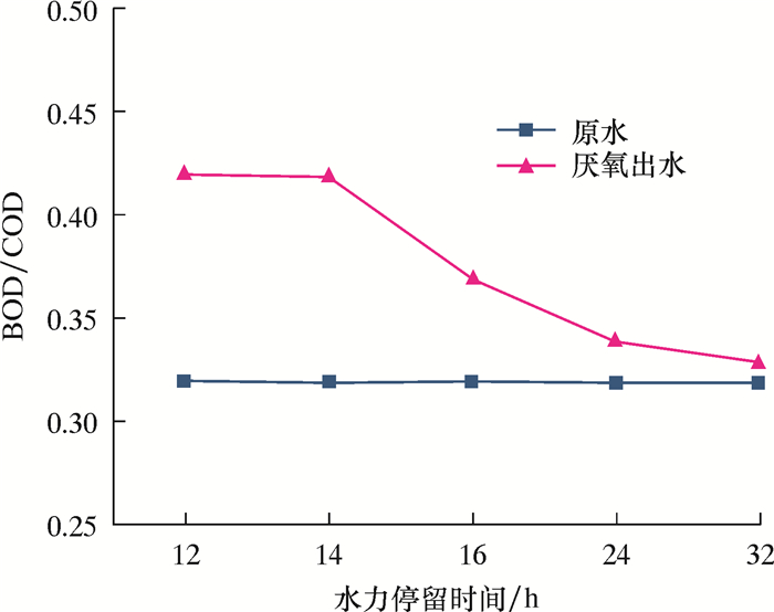从图 3可见,厌氧时废水ρ(BOD5)/ ρ(COD)值均高于原水,HRT越短,该比值越高,如HRT为14和24 h时,比值分别为0.42和0.34,均高于原废水的0.32。这是因为在厌氧条件下,大分子有机物发生开环、断链,增加了废水中BOD5浓度,改善了废水可生化性;HRT较短时,BOD5来不及被降解,使得ρ(BOD5)/ρ(COD)值较高。