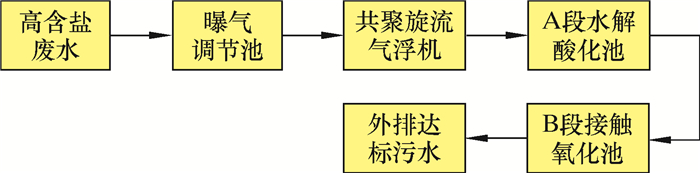 4.2 工艺流程选择A区块、B区块含盐废水开展了现场中试试验,选用“曝气调节—旋流气浮—水解酸化—接触氧化”工艺,中试处理规模200 m3/d。