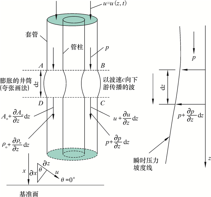 3 不稳定流动引起的压力波动模型 3.1 连续性方程对井筒中连续管取环形控制体ABCD,其长度为dz,其内有一个向下游方向传播的压力波,如图 1所示。在dt时间内流入控制体的流体质量可以表示为ρoAoudt,流出控制体的流体质量可以表示为