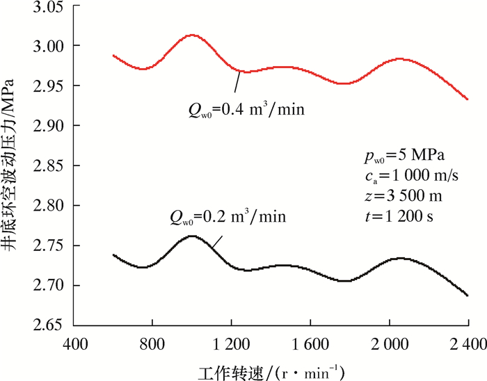 6.2 波动排量和工作转速对环空波动压力的影响所确定的井筒中环空波动压力pw的计算结果是一系列复数,其大小主要取决于工作频率ω(或工作转速n)和波动排量,因此这些复数的模数在一定的波动排量下随ω(或n)而变化。现计算不同波动排量下井深3 500 m处不同工作转速(n)下的pw模数,就可以得到|pw|随工作转速的变化曲线,如图 2所示。由图 2可以看出:相同波动排量下,随着压裂泵工作转速的增大,井筒中环空流体的不稳定流动加剧,从而引起井底环空波动压力出现明显的波动;当工作转速约为1 000和2 000 r/min时,井底环空波动压力均出现最大值;在相同工作转速下,随着波动排量的增加,井底环空波动压力显著增大。上述结果表明,压裂泵的工作转速和波动排量显著影响井底环空波动压力,容易形成井壁围岩的交变应力,有利于储层岩石的起裂和延伸。