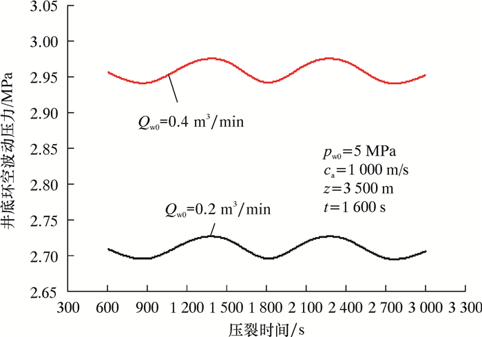 6 应用结果与分析已知某直井井深3 641 m,采用ø139.7 mm×9.17 mm P110套管完井。采用ø50.8 mm×3.96 mm QT900连续管波动注入环空加砂压裂工艺对该井盒8下1、山12气层进行压裂改造,射孔层位约3 450.0和3 500.0 m。在环空压裂过程中,主压裂泵数a=1,柱塞数k′=3,曲轴转速n=600~2 400 r/min;稳定排量Qs=3.0 m3/min,波动排量振幅Qw0=0.2~0.4 m3/min,波动压力振幅pw0=5 MPa;压裂流体密度ρo=1.4 kg/m3。下面对比分析井筒中稳定和不稳定流动对环空波动压力和环空压力的影响规律。