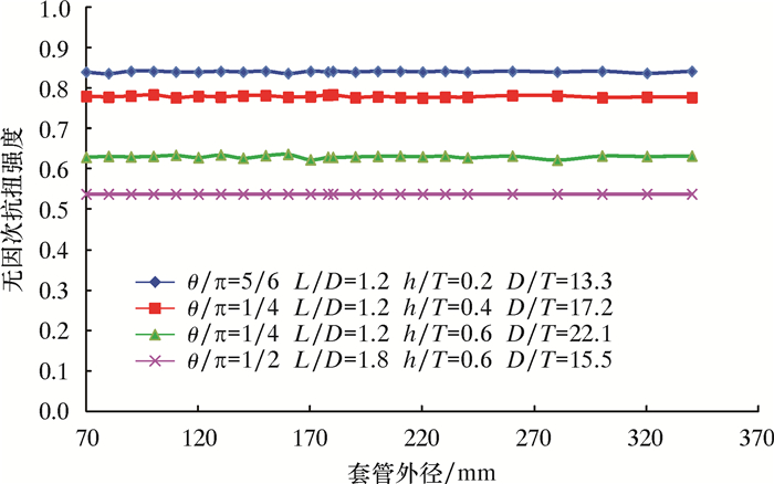 套管外径对无因次抗扭强度的影响如图 8所示。从图 8可以看出,当缺陷的相对深度、相对宽度、相对长度和套管径厚比一定时,套管外径对无因次抗强度基本无影响。如果两种缺陷套管几何尺寸相似,则可认为其无因次抗扭强度相同。