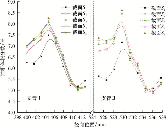 (2) 两支管内的油相体积分数大小总体表现为支管Ⅰ大于支管Ⅱ,而在同一支管内的油相体积分数大小由于支管分岔处受离心分离的作用表现为支管左侧明显高于支管右侧,在同一截面内的油相体积分数大小则表现为中心高、周围低的趋势。