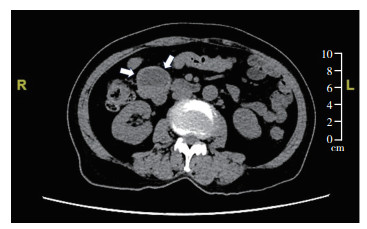 | 注 腹部CT扫描示十二指肠降段囊实性结节状肿块(箭头示) 图 1 BRAF突变型胃肠间质瘤的影像学表现 Fig.1 Imaging manifestations of BRAF-mutated gastrointestinal stromal tumors |