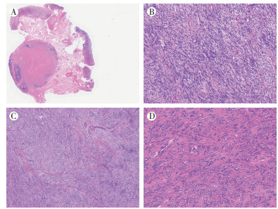 | 注 A:肿瘤位于肌层,瘤周可见丰富的淋巴细胞浸润,形成淋巴套样结构(HE×10);B:肿瘤细胞呈梭形,细胞形态温和,无明显异型性,核分裂象少见(HE×200);C:梭形肿瘤细胞呈条束状或交叉束状排列(HE×100);D:肿瘤间质中可见丰富的胶原间质(HE×200) 图 2 BRAF突变型胃肠间质瘤的组织学改变 Fig.2 Morphological features of BRAF-mutated gastrointestinal stromal tumors |