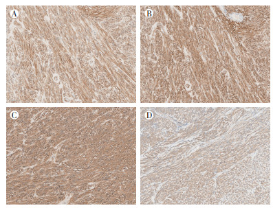 | 注 A:CD117弥漫阳性;B:DOG1弥漫阳性;C:CD34弥漫阳性;D:BRAF VE1弥漫阳性 图 3 BRAF突变型胃肠间质瘤的免疫表型改变(EnVision×200) Fig.3 Immunohistochemical characteristics of BRAF-mutated gastrointestinal stromal tumors (EnVision×200) |