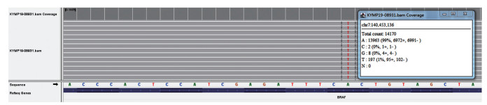 分子遗传学上,所有BRAF基因突变类型均为错义突变,且突变位点均位于第15号外显子1 799位碱基(c.1799T > A),即第600位蛋白质处缬氨酸被天门冬氨酸所取代(p.Val600Glu,即p.V600E;图 4)。同时伴有BRCA1关联蛋白1(BRCA1 associated deubiquitinase 1, BAP1)基因错义突变(c.102C > A,p.Asp34Glu)和NF1基因错义突变(c.2951G > A,p.Gly984Glu)各1例(6.7%)。另有2例(13.3%)检测到染色体1p缺失。