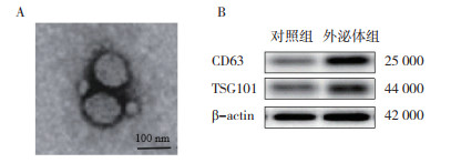 1.3 细胞培养与外泌体共培养处理将实验细胞分为两组,分别为对照组和外泌体组。37℃ 5% CO2及饱和湿度条件下培养,细胞贴壁生长,之后每2天换液1次。待细胞长满瓶底后进行细胞传代处理(0.25%的胰蛋白酶消化2 min)。其中外泌体组采用与细胞培养液混合方式加入终浓度为0.50 μg/μL的外泌体处理细胞24 h,对照组细胞常规细胞培养液培养24 h。