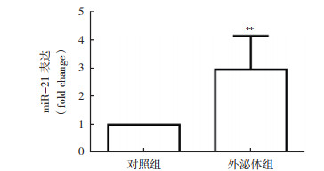 | 注 **与对照组比较,P < 0.01 图 2 外泌体组SGC-7091细胞miR-21表达增加 Fig.2 The increased expression of miR-21 in SGC-7091 cells in the exosome group |
