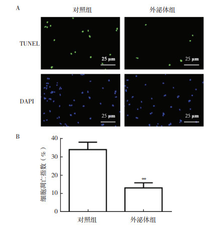 TUNEL染色检测胃癌细胞株SGC-7091凋亡情况显示,与对照组比较,外泌体组细胞凋亡降低(P < 0.01,图 3)。
