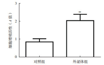 | 注 **与对照组比较,P < 0.01 图 4 MTT检测示外泌体组细胞增殖活性升高 Fig.4 MTT assay showed increased cell proliferation activity in the exosome group |
