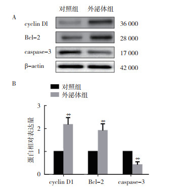 | 注 A:Western blot检测cyclin D1、Bcl-2和caspase-3表达; B:相关蛋白表达统计图; **与对照组比较,P < 0.01 图 5 外泌体处理对细胞凋亡和增殖相关蛋白表达影响 Fig.5 Effects of exosome treatment on the expression of apoptosis and proliferation-related proteins |