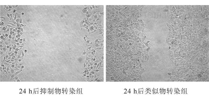 2 结果 2.1 miR-200c对SW480细胞迁移能力的影响细胞划痕实验显示(图 1),12 h后类似物转染组和类似物阴性对照组伤痕宽度分别为(589.60±17.28)μm和(465.32±16.60)μm(P < 0.05)。24 h后类似物转染组和类似物阴性对照组伤痕宽度分别为(523.82±57.13)μm和(393.98±7.53)μm(P < 0.05)。12 h后抑制物转染组和抑制物阴性对照组伤痕宽度分别为(430.92±20.76)μm和(485.63±16.65)μm(P < 0.05)。24 h后抑制物转染组和抑制物阴性对照组伤痕宽度分别为(221.37± 44.37)μm和(441.21±22.40)μm(P < 0.05)。