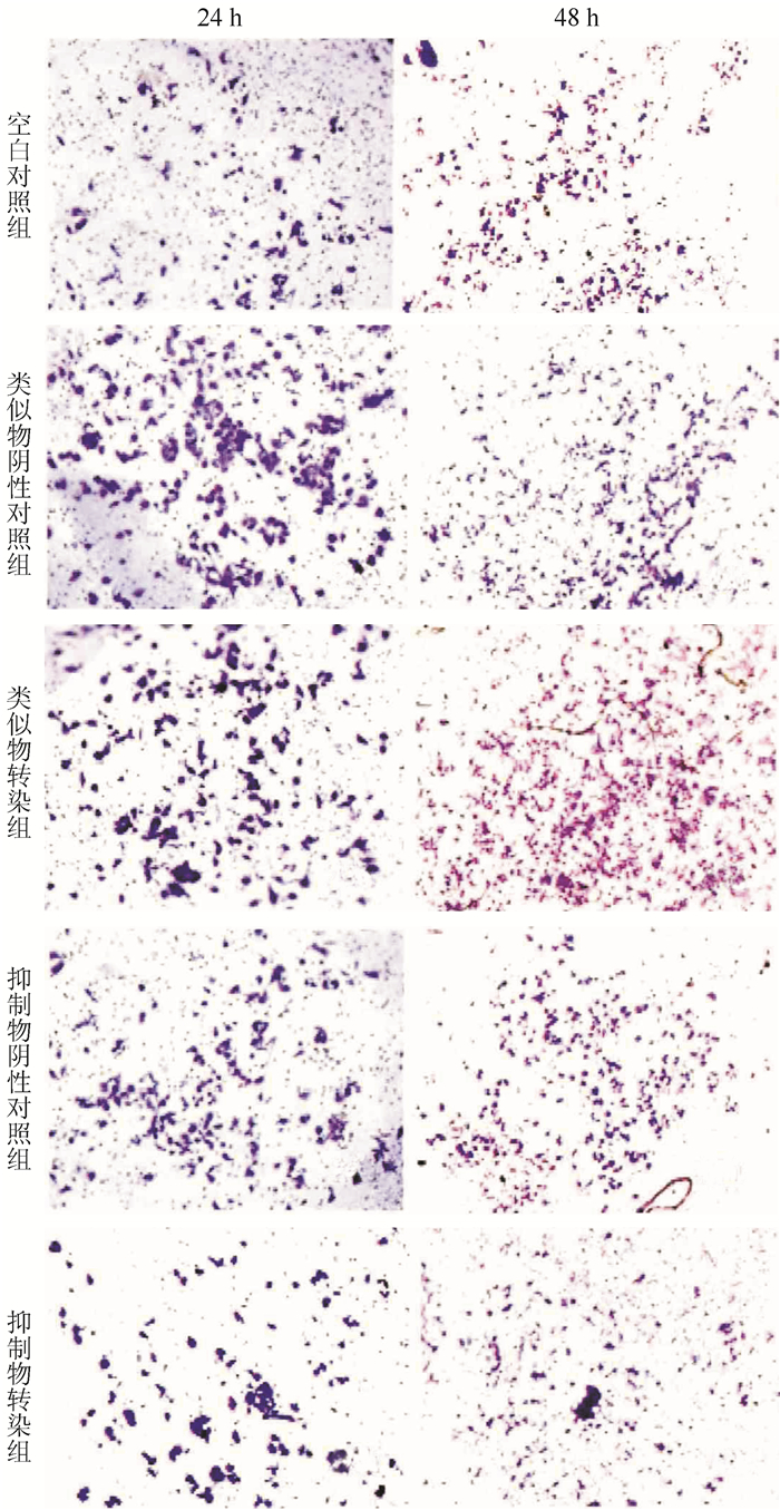 Transwell侵袭实验显示,24 h和48 h后类似物转染组通过8 μm孔径的细胞数目降低,与类似物阴性对照组以及空白对照组间比较,差异均具有统计学意义(均P < 0.05,图 2)。抑制物转染组细胞通过数目增加,高于抑制物阴性对照组以及空白对照组(均P < 0.05)。提示miR-200c的过表达对SW480细胞侵袭产生抑制,miR-200c的低表达能够促进SW480细胞的侵袭。
