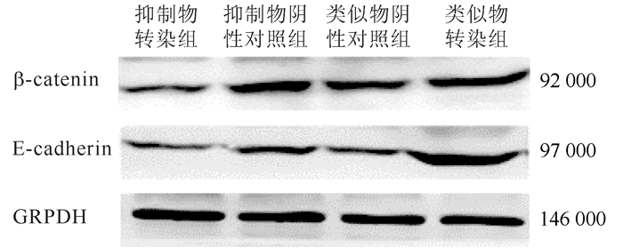 类似物转染组细胞β-catenin和E-cadherin蛋白表达均升高(均P < 0.05),抑制物转染组细胞β-catenin和E-cadherin蛋白表达均降低(均P < 0.05,图 3)。