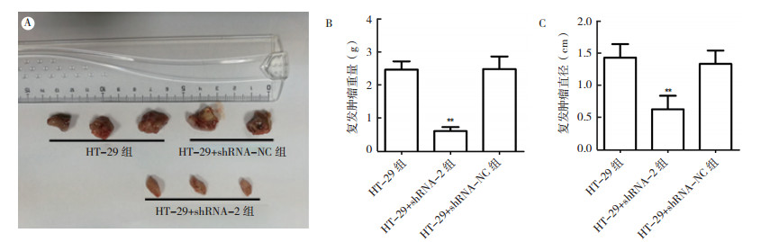 各处理组裸鼠的复发结肠癌结果显示, 三组均出现复发。与HT-29组比较, HT-29+shRNA-2组裸鼠的移植瘤切除8周后复发肿瘤直径及重量分别降低55.8%和75.3%(均P < 0.01, 图 4)。HT- 29+shRNA-NC组与HT-29组比较, 复发肿瘤直径和重量差异均无统计学意义(均P>0.05)。