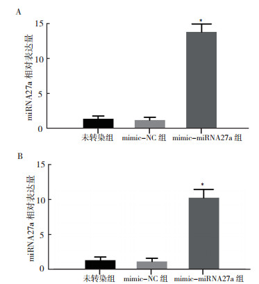 | 注 A:HeLa细胞;B:SiHa细胞;*与未转染组和mimicNC组比较,均P < 0.05 图 1 HeLa细胞和SiHa细胞miRNA27a模拟物转染24 h后miRNA27a相对表达量 Fig.1 Relative expression of miRNA27a in HeLa cells and SiHa cells after 24 h transfection with miRNA27a mimic |