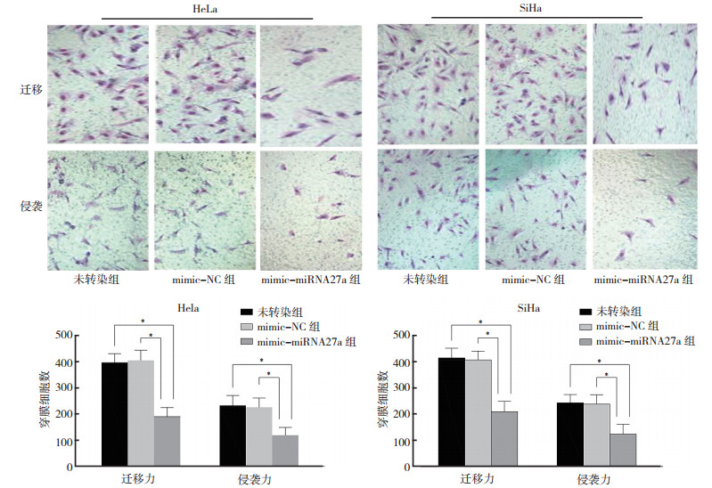 Transwell小室侵袭实验显示, 在子宫颈癌HeLa细胞和SiHa细胞中, 转染24 h后, mimic-miRNA27a组与mimic-NC组、未转染组比较, 2种细胞的穿膜细胞数均减少, 差异均具有统计学意义(均P < 0.05, 图 2); mimic-NC组与未转染组比较, 差异均无统计学意义(均P>0.05)。
