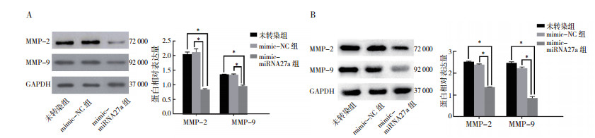 2.4 上调miRNA27a可影响MMP-2和MMP-9蛋白的表达Western blot实验显示, 转染24 h后, 在HeLa细胞和SiHa细胞中, mimic-miRNA27a组与mimicNC组、未转染组比较, 2种细胞中MMP-2和MMP-9蛋白表达量均降低, 差异均具有统计学意义(均P < 0.05, 图 3); mimic-NC组与未转染组比较, 差异均无统计学意义(均P>0.05)。