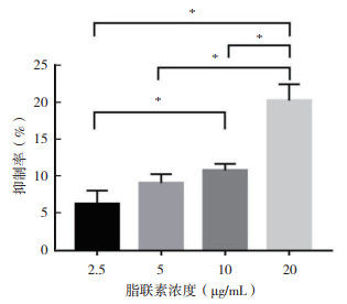 1.3 细胞实验 1.3.1 MTT法检测细胞增殖抑制率培养LoVo细胞至指数生长期,制成单细胞悬液后以4×105个/mL密度接种于96孔板,待细胞贴壁后加入重组人脂联素使孔中终浓度为2.5、5、10和20 μg/mL(2.5 μg/mL脂联素组、5 μg/mL脂联素组、10 μg/mL脂联素组和20 μg/mL脂联素组),同时设空白对照组,每组设3个复孔,培养24 h,弃上清液,加入90 μL新鲜10%胎牛血清(fetal bovine serum,FBS)培养液,再加入10 μL噻唑蓝(thiazdyl blue tetrazolium bromide,MTT)溶液,继续培养4 h后弃上清液,每孔加入100 μL二甲基亚砜(dimethyl sulfoxide,DMSO),低速振荡10 min,于酶联免疫检测仪490 nm处测量其吸光度(absorbance, A)值。细胞增殖抑制率(%)=(1-实验组细胞A值平均值/对照组细胞A值平均值)×100%。