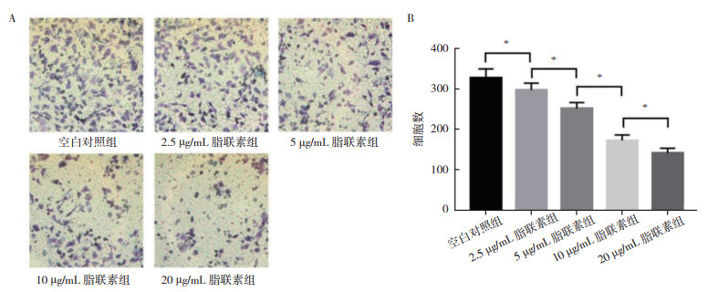 空白对照组、2.5 μg/mL脂联素组、5 μg/mL脂联素组、10 μg/mL脂联素组和20 μg/mL脂联素组LoVo细胞穿膜细胞数分别为(329±22)个、(299±17)个、(253±15)个、(174±14)个和(143±12)个(图 2A)。与空白对照组比较,不同浓度的重组人脂联素作用LoVo细胞24 h后,穿膜细胞数均减少,浓度越高,穿膜细胞数越少,组间两两比较差异具有统计学意义(均P < 0.05,图 2B)。