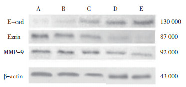 | 注 A:空白对照组;B:2.5 μg/mL脂联素组;C:5 μg/mL脂联素组;D:10 μg/mL脂联素组;E:20 μg/mL脂联素组 图 3 Western blot法检测不同浓度脂联素对LoVo细胞E-cad、Ezrin和MMP-9蛋白表达的影响 |