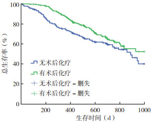 | 图 1 有无接受术后化疗的局部晚期食管鳞癌患者的总生存曲线 Fig.1 Overall survival curves of locally advanced esophageal squamous cancer patients with and without postoperative chemotherapy |