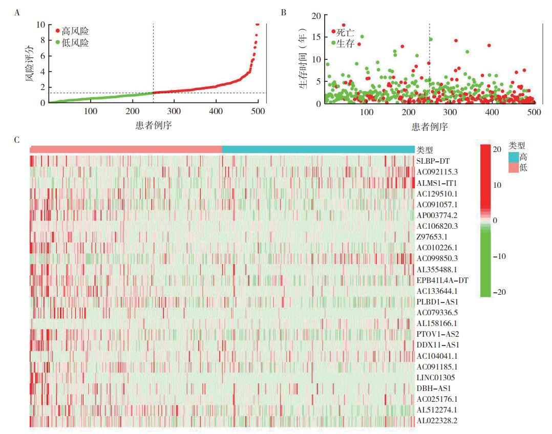 1.2 方法 1.2.1 HNSCC铁死亡基因与相关lncRNA的共表达分析使用R软件计算铁死亡基因和铁死亡相关lncRNA之间表达的相关性。若P < 0.001,两者之间存在共表达关系;相关系数cor > 0,两者为正调控关系,cor < 0,两者为负调控关系。借助Cytoscape软件(version: 3.8.2)将铁死亡基因与铁死亡基因相关的lncRNA之间的共表达关系构建可视化的共表达网络。