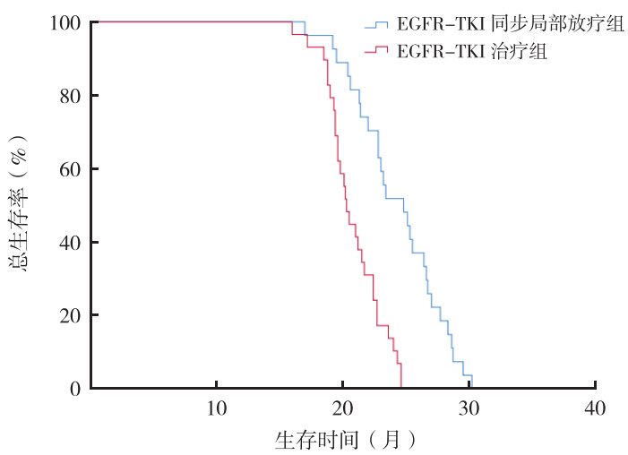 | 注 EGFR:表皮生长因子受体(epidermal growth factor receptor);TKI:酪氨酸激酶抑制剂(tyrosine kinase inhibitor) 图 1 EGFR-TKI同步局部放疗组与EGFR-TKI治疗组患者总生存曲线比较 |