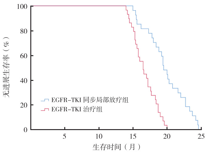 | 注 EGFR:表皮生长因子受体(epidermal growth factor receptor);TKI:酪氨酸激酶抑制剂(tyrosine kinase inhibitor) 图 2 EGFR-TKI同步局部放疗组与EGFR-TKI治疗组患者无进展生存曲线比较 |